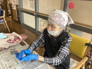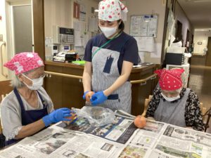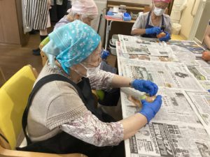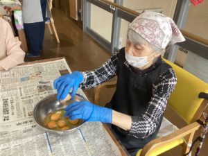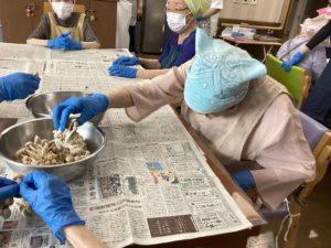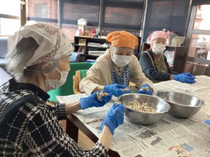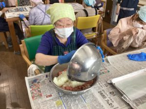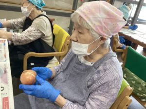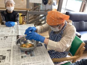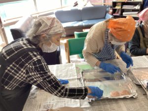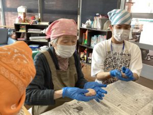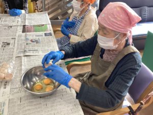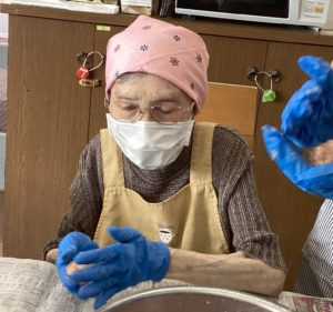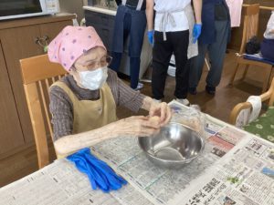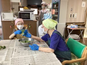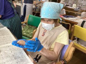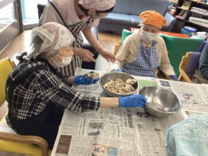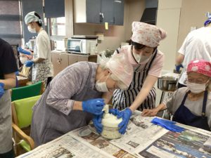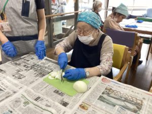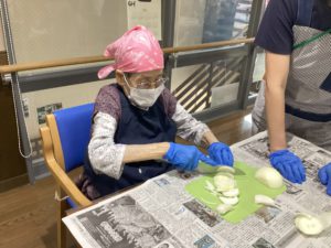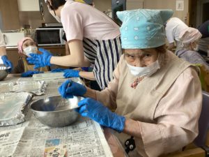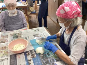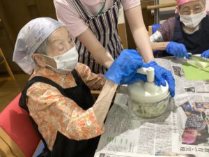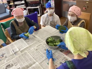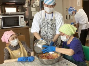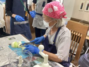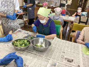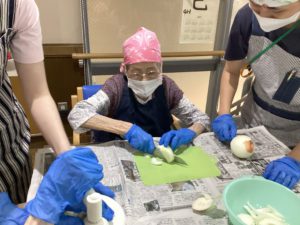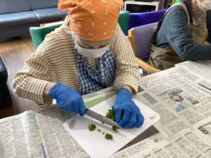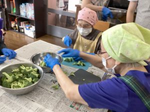 皆でエプロン&バンダナを着用し、野菜を切ったり混ぜたりと、たくさんする事がありました。