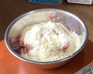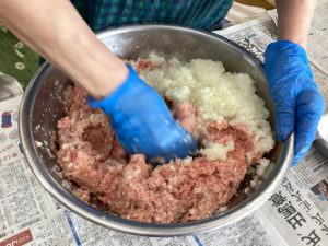 ひき肉、パン粉、牛乳を入れたボウルに入れて、細かく切った玉ねぎと一緒に混ぜて頂きました。