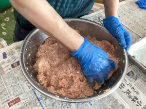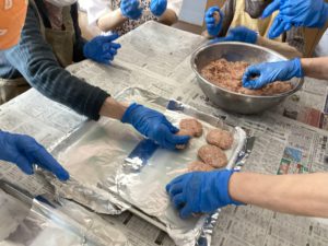 きれいに混ざったら、皆様の手を借りてハンバーグの成形です。