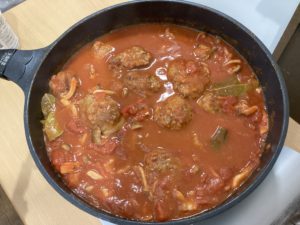 フライパンで焼いて、トマトソースで煮込んで・・・完成です。