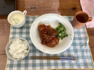 9月の昼食クッキングは、煮込みハンバーグと冷製コーンスープ。