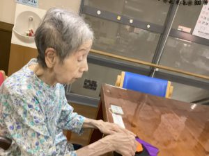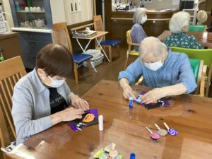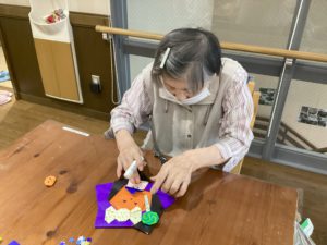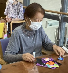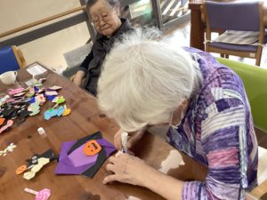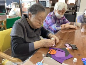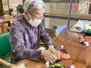 台紙や色々な顔をしたカボチャや黒猫などをご自身で選んで頂き、思うようにのりで貼り付けて頂きました。