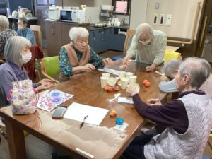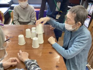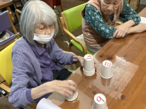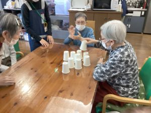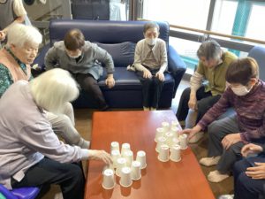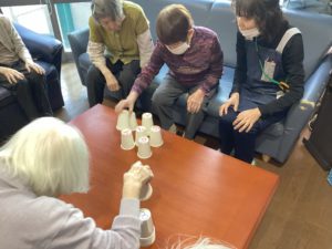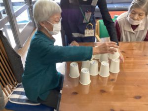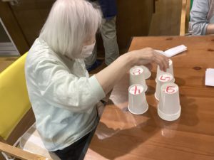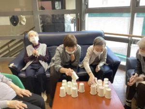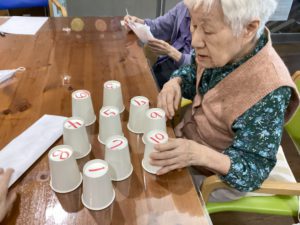 紙コップにお手玉を投げて入れるレクリエーションもしました。