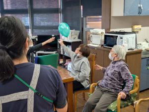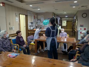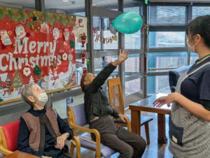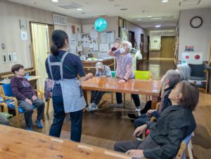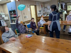 全ご利用者様総勢12名で風船バレーをすると、大概に大きな輪になっています。