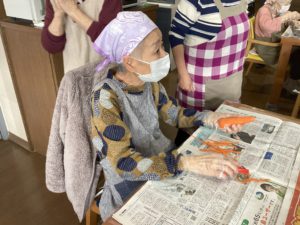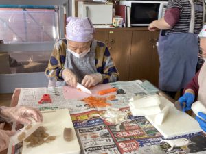 人参、大根の皮をむいていちょう切りに、こんにゃく、鶏肉、竹輪を食べやすい大きさに切って頂きました。