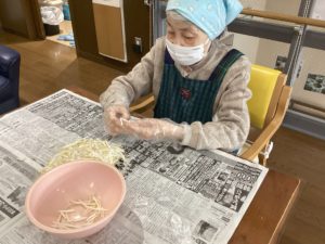 もやしの量が多いので、大人数でひげ取りをしました。