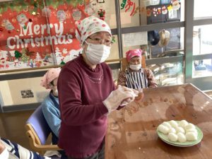 炊けたご飯を素早く握って頂き、お皿の上でふりかけをかけるとおにぎりの完成です。