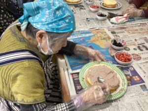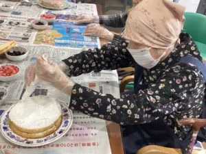 ご利用者様には白とチョコレート色のホイップをスポンジに塗って頂きました。