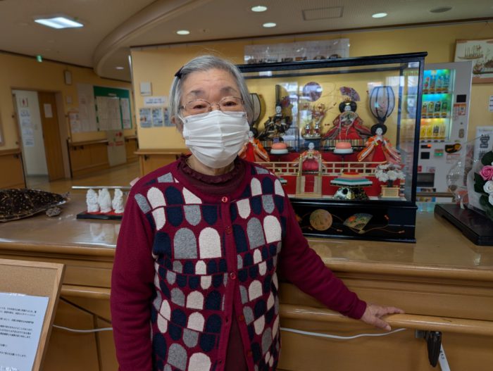 散歩中、エントランスのひな人形の前で記念撮影をしました。