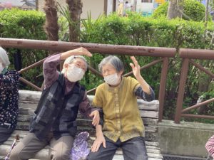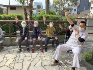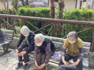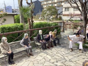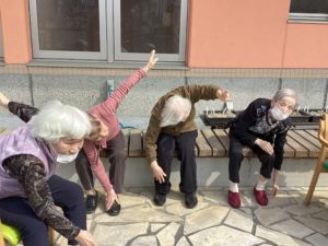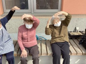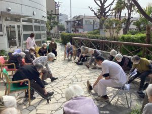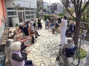 皆で散歩に出かけたら、テラスでアーバンケア稲田デイサービスの皆様が体操している所へ合流。