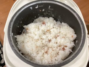 といだお米に種をとった梅干しを入れ、味付けをして炊飯。