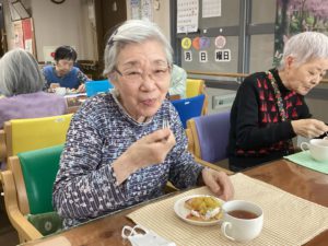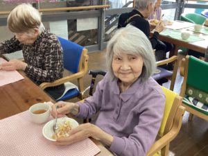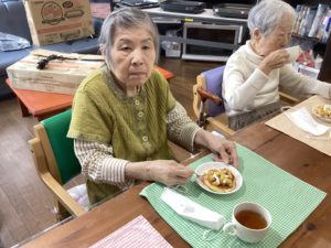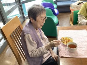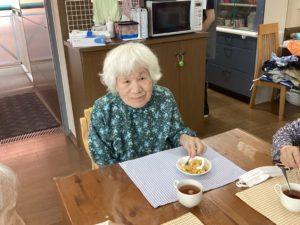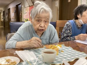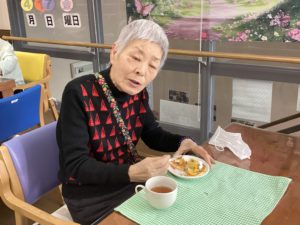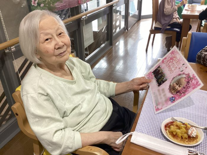 職員からはバースデイカードをプレゼントし、皆で作ったパンケーキと紅茶をいただきました。