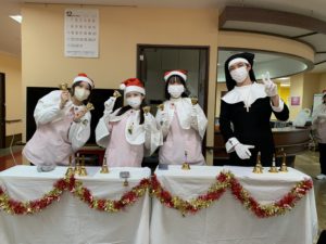 皆様こんにちは! 本日はクリスマスです。楽しいひと時をお迎えのことと思います。老健アーバンケアでは毎年クリスマス会を開きますが、今年は若手職員がハンドベルを披露しました✨✨ 仕事が終わってから一生懸命練習し、「きよしこの夜」「ジングルベル」を演奏しました! そしてサンタとトナカイからプレゼントを皆様にお渡ししました。その様子をご覧ください(*^-^*)