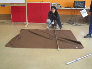 次に一人が入る位の幅の所にもう1本の竿を置きます。この時、毛布が重なる位置に竿を置いて下さい。