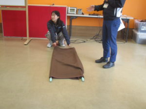 寝たきりの方を担架に乗せるときは体を斜めにしていただき、床と体の間に担架を挟むと乗せやすくなります。