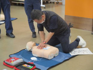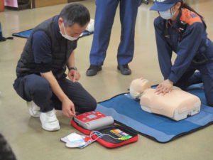 AEDが届いたら、電源を入れて指示の通りにパットを貼ります。あとはAEDが電気ショックが必要か判断してくれます。