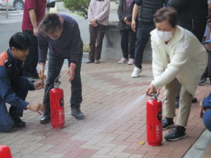 消火器の使い方を学びました。実際に使用して操作方法を学びました。