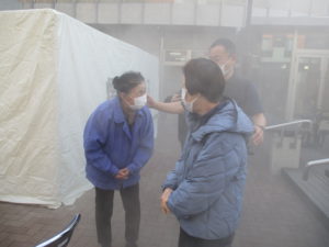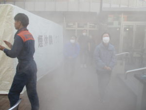 煙の中は視界が悪く、上の方は煙が濃く、足元は煙が薄いことがよくわかりました。煙の中御w逃げるときは姿勢を低くして、鼻と口を覆って非難することが大切と身をもって体験しました。