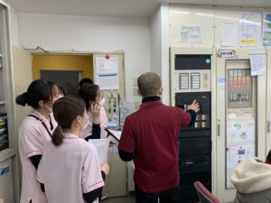 火災場所を発見した職員は、まず非常用ベルを鳴らして、フロアーに周知と初期消火を行います。