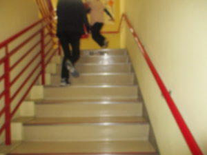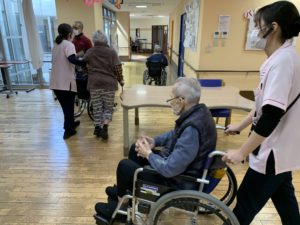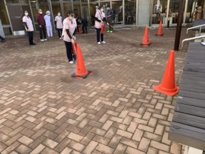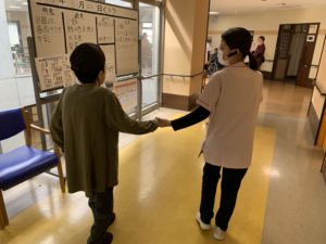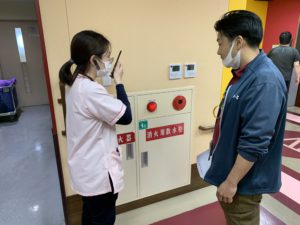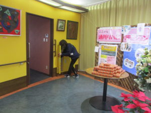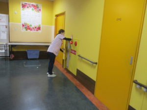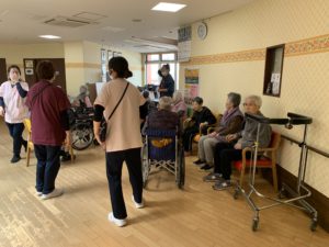 火災が自分の背を超えて、天井まであがると初期消火では間に合いません。次は、利用者様の安全を確保するため、できるだけ火災場所から離れた場所まで誘導する必要があります。手分けして、利用者様にも避難訓練に参加して頂きました。最後に点呼をし、利用者様の人数を確認します。