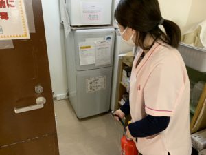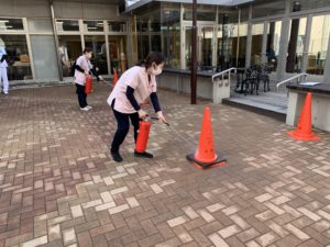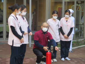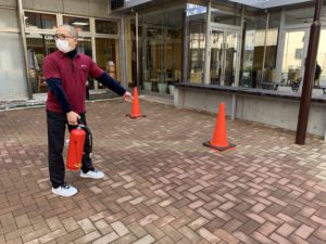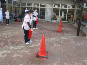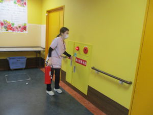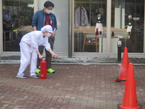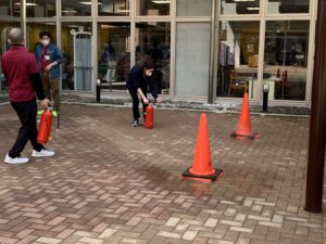 消火器の使い方や注意点を学んで、実際に消火器を使った訓練を行いました。