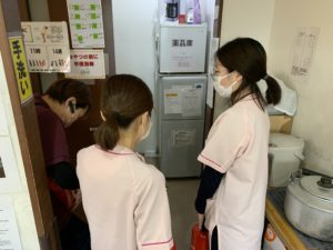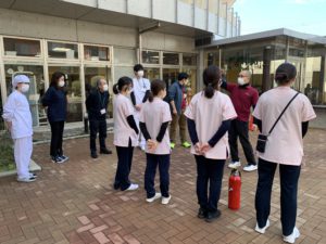 日中よりも職員人数が少なくなる夜間の火災を想定して、火災時の動き方を確認しました。新人職員にも学んでいただきます。