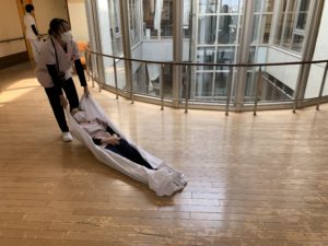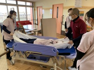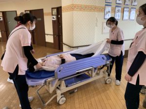 頭がぶつからないように注意しつつ、ベッドから床まで下ろすことができれば、女性職員でも一人で運ぶことができました。