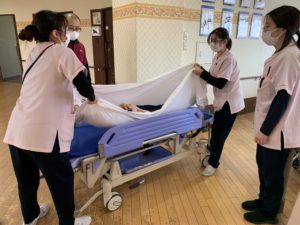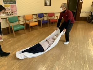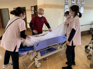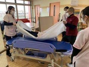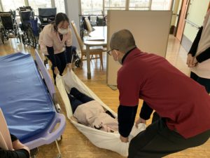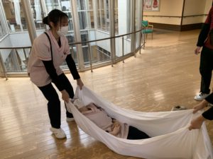 そういう時は、ベッドシーツを活用して、シーツのまま利用者様を運びます。