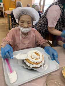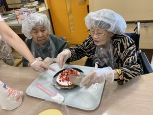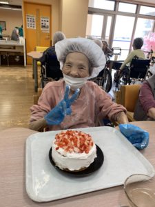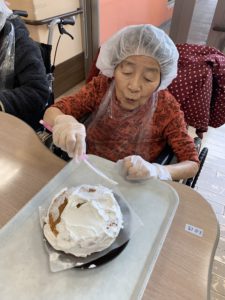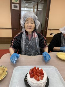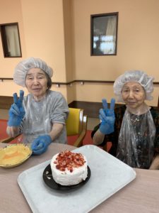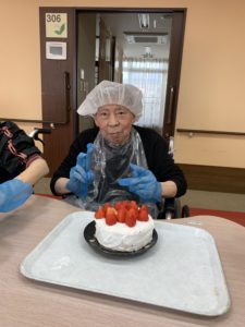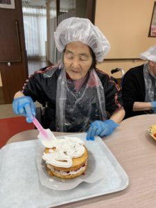 今月はいちごをたっぷり使ったケーキを作りました。ケーキの間にもいちご、上にも大粒のいちごです。皆さま上手に盛り付けて頂けました(*^▽^*)