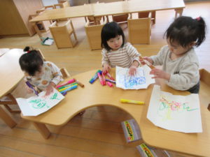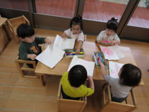 キャップが硬くて開けれなかった子も指先や力の使い方が分かってくると開けられるようになり、自分たちで好きな色を選んでカキカキ…