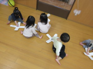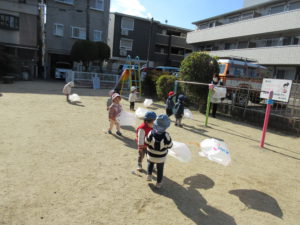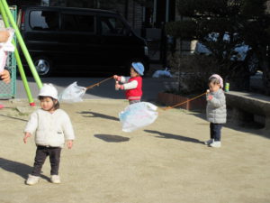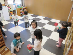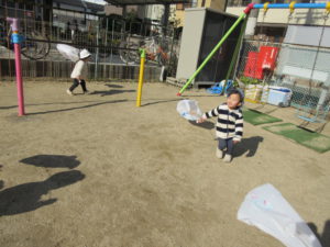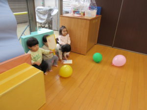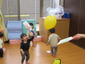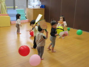 風船を羽根に見立てて渡すと、羽子板を使って「エイ!」と叩き、保育士とラリーする子もいました。