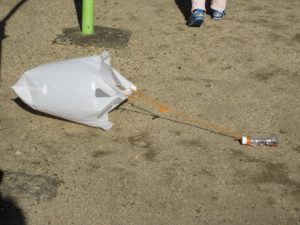レジ袋で作り、持ち手はボトルにボタンやビーズを入れておもりも付けました。