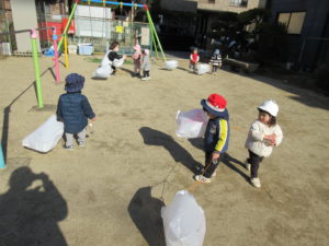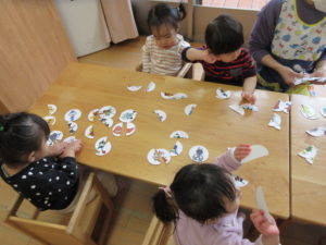 牛乳パックを使って製作したので手を入れて口を動かす事もでき、「がぶがぶ~」と追いかけっこを楽しみました。