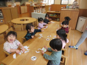 獅子舞の服は野菜スタンプでデザインし、顔は「目」「歯」と言いながら思い思いに貼り付けオリジナル獅子舞の完成です。
