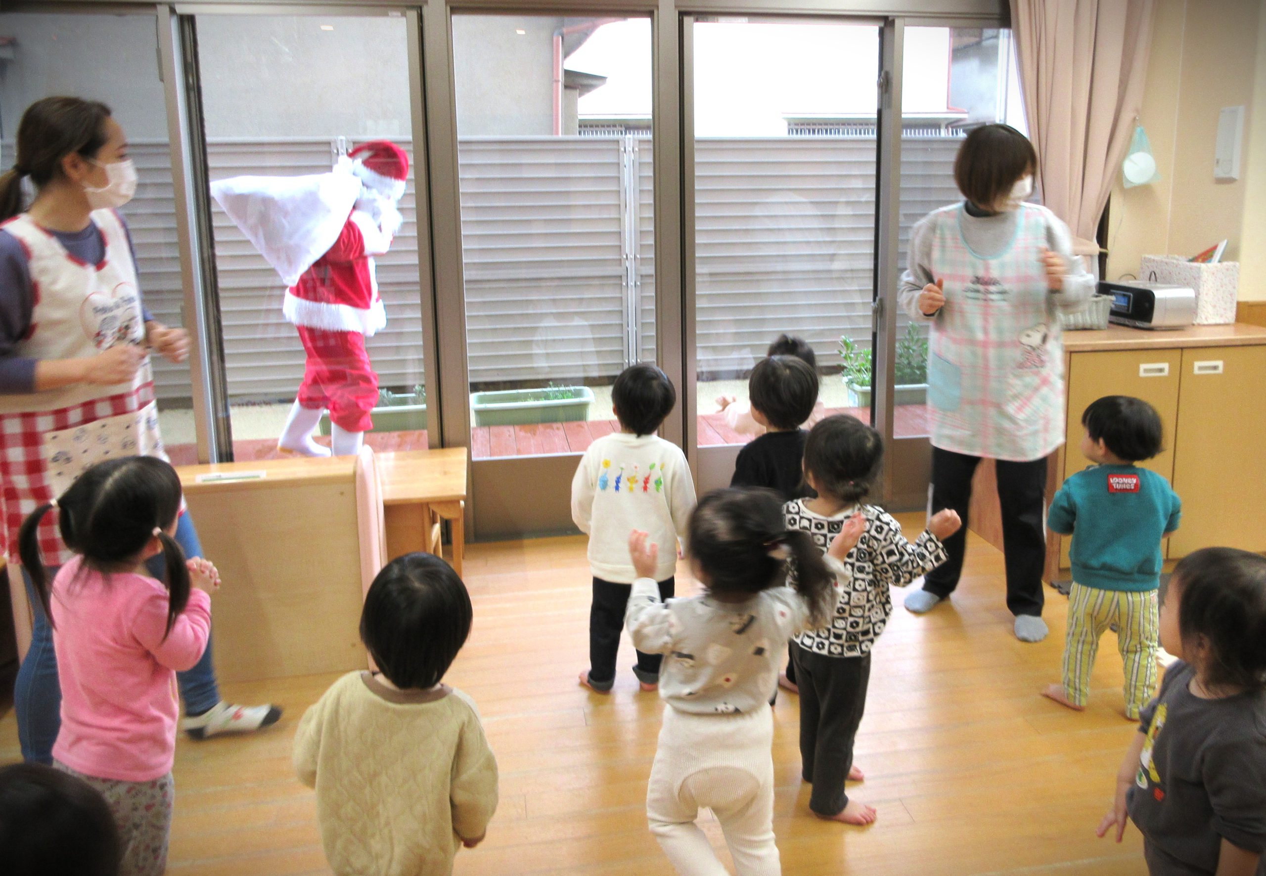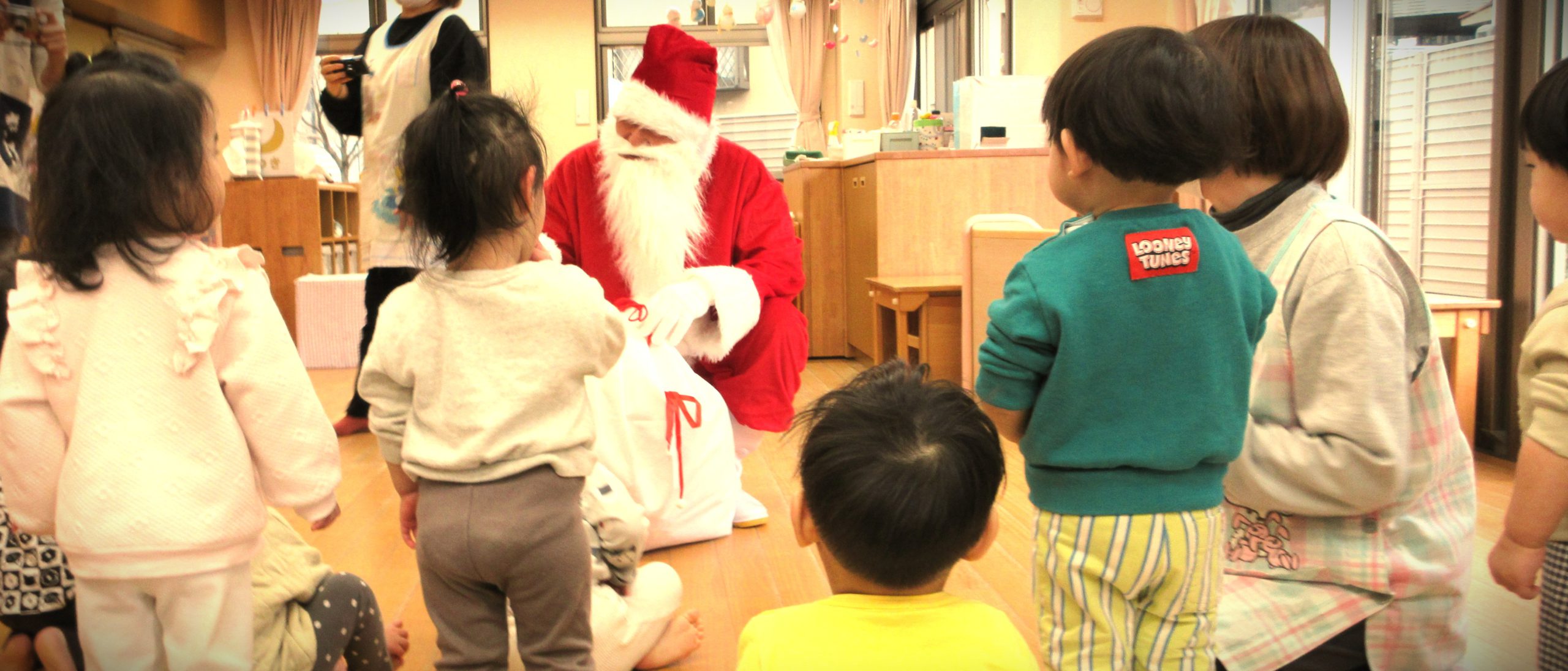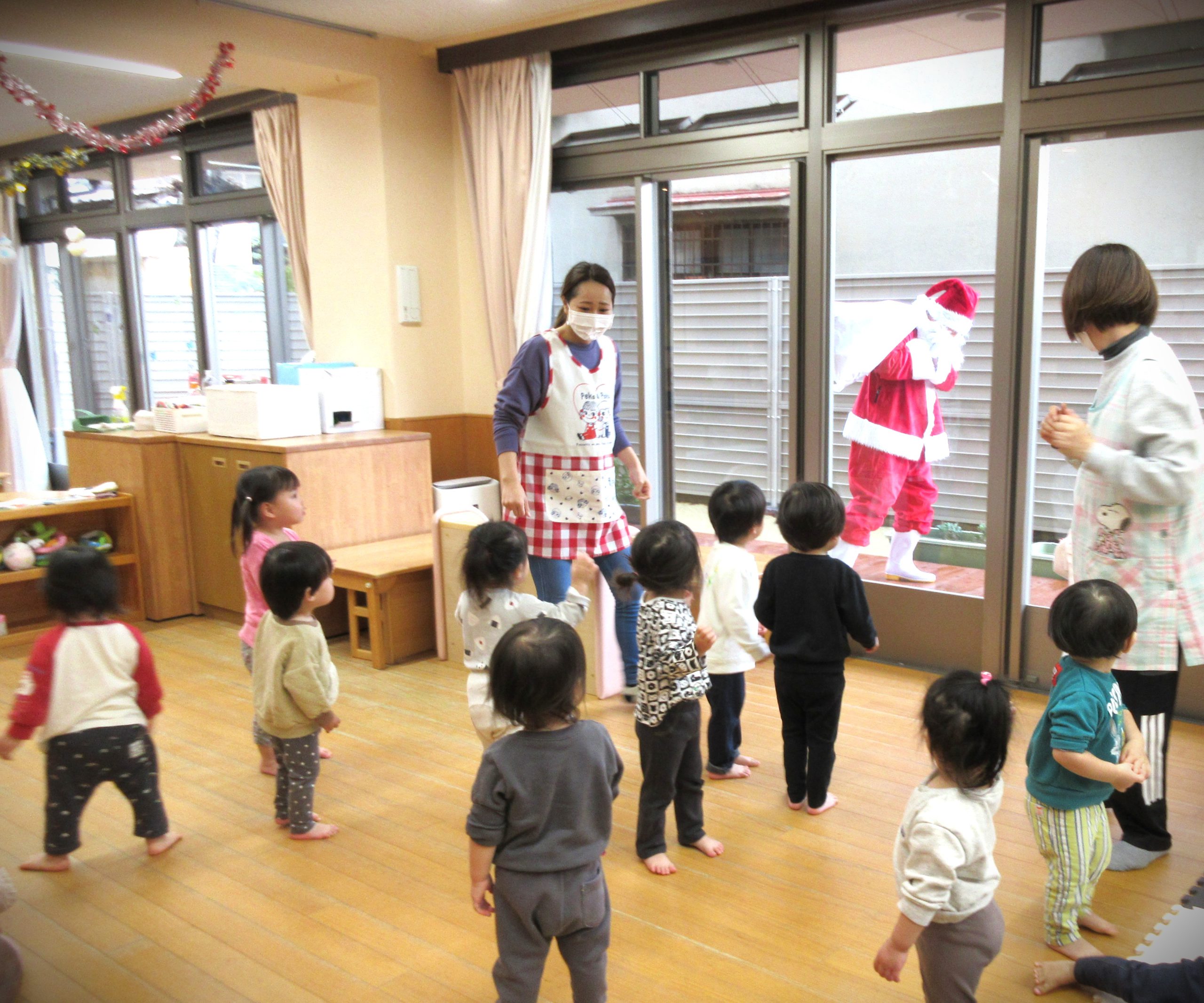 「え!?サンタさん!?」子どもたちは前へ前へ…興味津々です。