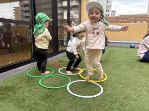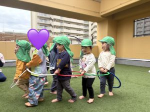 フラフープを用意すると、子どもたち自身でフラフープを繋げて電車を作っては、「ばいば〜い👋🏻」と言って担任に手を振り、「がたんごと〜ん」と言いながらみんなで遊んでいました🚃♪