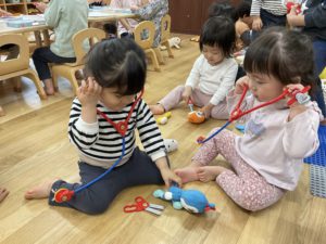 お医者さんになりきったり、お人形のお世話をしたり、ご飯を作ってお友だちと一緒に食べては楽しそうな様子が見られますよ😆👏🏻