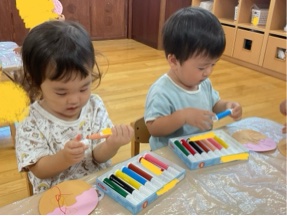 描き方、貼り方一つでもそれぞれの特徴があり、子どもたち自身も自分の作品だけでなくお友だちのものにも興味を示し、「見せて!」「○○みたいだね」「○○色だね」とお話ししながら楽しんでいる様子も多く見られました。