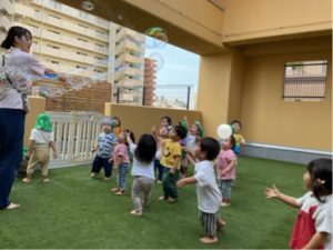 また、シャボン玉を飛ばすと「大きいの!」と保育者に注目したり、一つのシャボン玉が割れるまで追いかけて手を伸ばしたりとそれぞれの楽しみ方で遊んでいます。