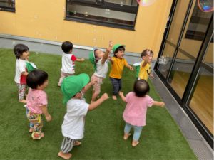 お友だちや保育者と手を繋ぎお歌を歌いながら歩いたり、菜園の様子を観察して遊んでいるのですが、空を眺めクレーン車や飛行機を発見すると、一斉にみんなで空を見上げ見つけたことを伝えて喜ぶ姿が見られます。