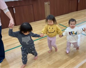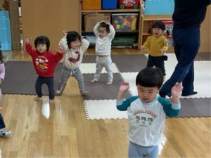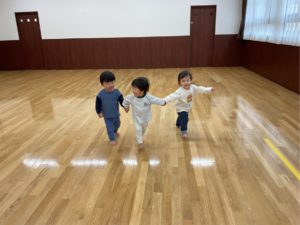 「かめ」や「両生類のはいはい」の動き、音楽に合わせて友だちと手をつないで歩いたりと、新しい動きにも興味を持って挑戦し、楽しみ方が少しずつ広がっています。同じ音楽を感じながら、友だちと一緒に動く心地よさを味わう姿が見られました。