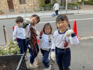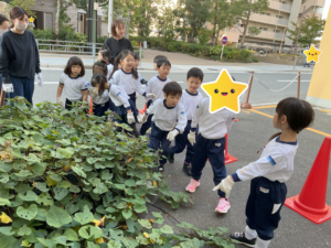 昨年度までは、東花園の系列園のアーバンチャイルドこども園に行き、近くの畑で芋掘りをしていましたが、今年は小さいですが自園での芋畑だったので、全クラス芋掘りを体験することができました⭐