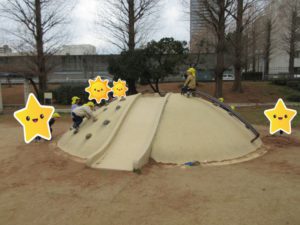 大好きな縄跳びをしたり、鬼ごっこをしたり、また身体を十分に使って遊具に登ったりして、好きな遊びを見つけて遊んでいました。風が強い日ではありましたが、砂に絵を描いたりして自由に遊んでいました!