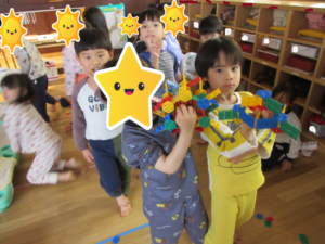 給食を食べ終えると自由に遊び時間があり、毎日子ども達は試行錯誤しながら友だちと相談しながら、何かを作り上げています!出来上がると「先生みて!」っと、必ず見せてくれる子どもたち!毎日色んな発想が生まれているようで、逞しく思います☺