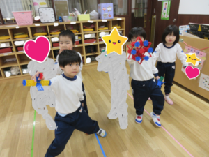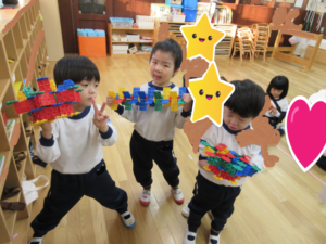 友だちと様々な形を作って見せ合ったり、一緒に想像力を膨らませて、考えて作り上げていく事も楽しんでいます。