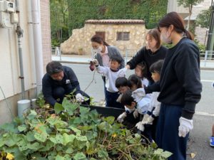 こども園の横にあるプランターで育てていた芋を収穫しにいきました。大きな葉っぱや長いつるにびっくりしながら、「お芋どこにあるかな〜?」とみんなで探しながら掘り進めていました☺️保育室ではつるを使ってクリスマスリースも作って楽しみました。