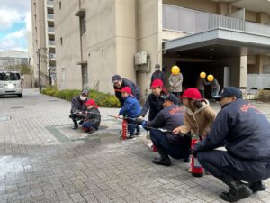 消火器の使い方を教えていただき、実際に使ってみました。的を狙うのが難しい様でしたが、真剣な目をして消火訓練を体験していました。また、被災したときに使う【簡易トイレ】のお話も聞きました。「水で流さないのにどうするの?」「なんで水が固まるの〜?」と様々な疑問を問いかけながら、興味津々に聞いていました😊最後に消防車の前で服を着て写真も撮りました。消防車に乗っている人と同じ服を着れて、とっても嬉しそうでした💖