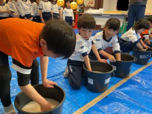 優しく優しく洗っていると、どんどん濁っていき「すごい!色が変わってる😳」と驚いていました。「明日のお餅つき楽しみだね〜」とお友だちと会話しながら洗ってくれていました。当日は【よいしょ!】という掛け声と共に、一生懸命にお餅をつきました。綺麗な丸になるまで心を込めてお餅を丸めていました🤭