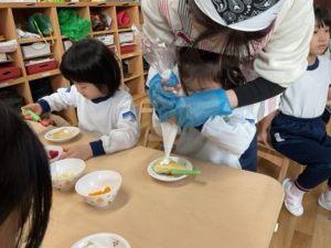 こすもす組はトナカイや雪だるま、サンタさんなど自由に帽子や衣装を作って、クリスマス会に参加しました。この日のおやつでは、自分たちでケーキを作りました🍰生クリームをしぼった後はフルーツを盛り付けました。「いちごはどこに乗せようかな〜」とデコレーションにこだわっていました✨生クリームが少し残ったので「もう少し欲しい人いますか〜?」と聞くと「はーーーい!」とたくさんのお友だちが手をあげていました!生クリーム増量で美味しそうなケーキが出来上がっていました💡