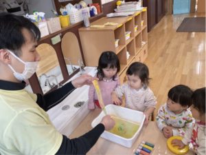 マーブリングでは好きな色を選び色が混ざったり模様になっていく様子をじーっと見つめる子どもたち。自分の番が終わってからもお友だちが行う様子を見守り「きれいだね〜」などと話していました。折り紙では保育者が折り方を伝えながら半分に折る姿に集中しており、ぴっと1本指でアイロンをかけるように折る姿も見られ、子どもたちの「どうやってるんだろう」と観察する力に驚きました。